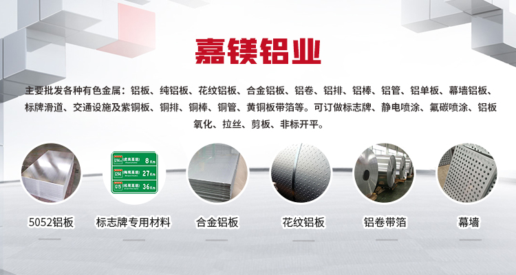 嘉鎂鋁業(上海)有限公司主要批發各種有色金屬:鋁板、純鋁板、花紋鋁板、合金鋁板、鋁卷、鋁排、鋁棒、鋁管、鋁單板、幕墻鋁板、標牌滑道、交通設施及紫銅板、銅排、銅棒、銅管、黃銅板帶箔等。可訂做標志牌、靜電噴涂、氟碳噴涂、鋁板氧化、拉絲、剪板、非標開平。公司的優質產品在多個行業中均有發揮優良的性能,表現極佳,廣泛應用于航空、汽車、船務、電子、醫療等行業...
